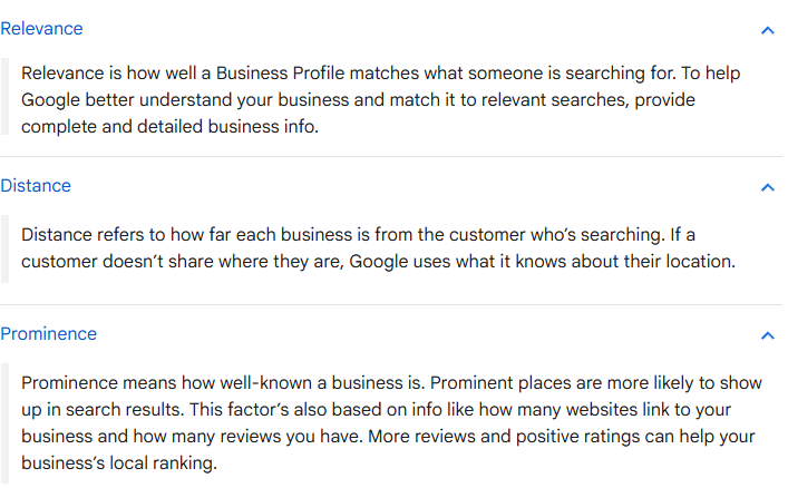 Google’s local ranking algorithm focuses on three main factors: relevance, distance and prominence.