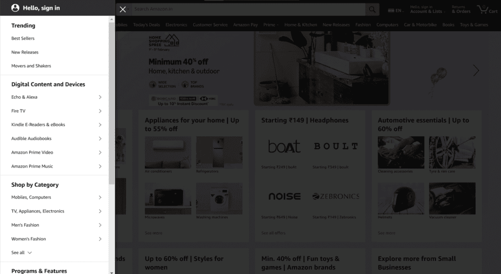If you’re competing with Amazon, click the ‘All’ button at the top of their homepage. This will show you Amazon’s main categories, which can give you ideas for your own site.