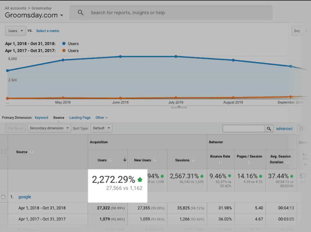 The links from this campaign helped boost Mike’s traffic by 2,272% during the wedding season compared to the previous year: